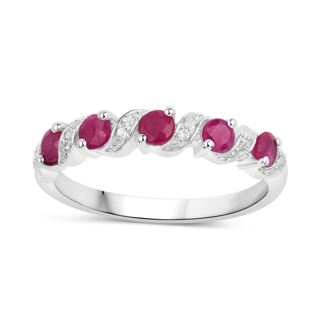 This Natural Ruby 5-Stone Ring is a striking expression of passion and elegance. Crafted in 925 sterling silver with a rhodium-plated finish, this dainty silver ring features five round natural ruby gemstones (0.65 ctw), securely prong-set to enhance their vivid pinkish-red brilliance. Accentuated by eight natural white topaz stones (0.04 ctw), this July birthstone ring has a gross weight of 2.74 grams. Measuring 21.59mm in width, 3.81mm in length, and 3.30mm in height, this lightweight gemstone ring is designed for comfort and versatility, making it perfect for everyday wear or special occasions. Explore our full collection of Ruby Gemstone Jewelry